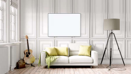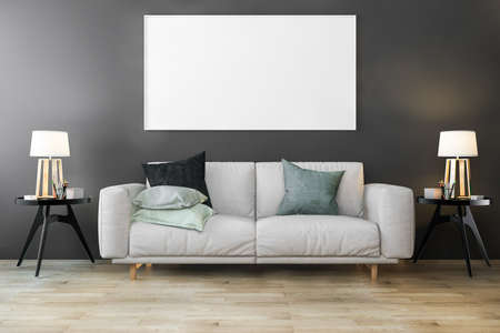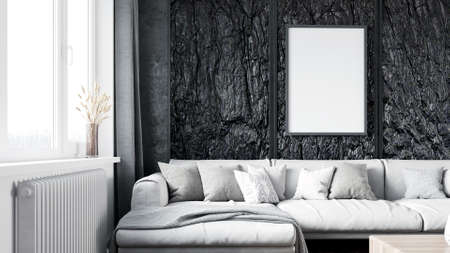 Interior of modern living room with mock up poster frame. 3d illustration
