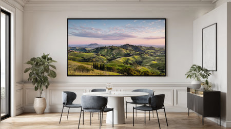 Large framed print of a picturesque landscape, featuring rolling hills of varying shades of green, detailed with trees and a light, pastel sky at dawn.