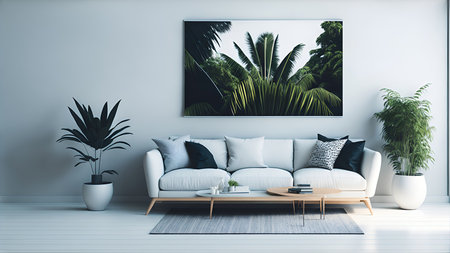 Modern living room interior with white sofa, coffee table and picture on wall