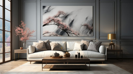 A stylish living room showcases a modern couch and serene abstract landscape art, creating a calm atmosphere ideal for relaxation and inspiration.