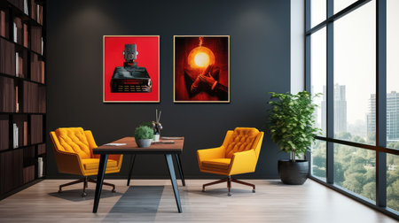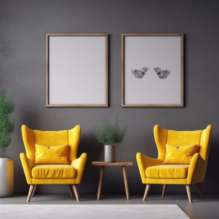 Yellow armchairs and big mock up poster frame on the gray wall. Mid-century interior design of modern living room