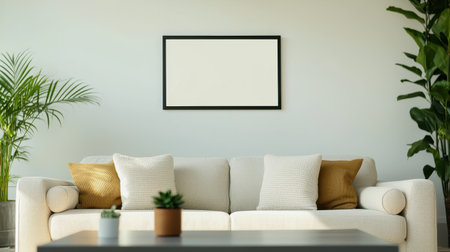 A cozy living room featuring a plush sofa, decorative cushions, a potted plant, and a blank wall frame, creating a serene and inviting atmosphere.