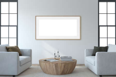 Modern living room interior. Interior and frame mockup. Two white armchaira near white wall. 3d render.