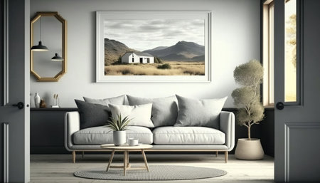 Interior of modern living room with gray sofa, pillows and picture frame