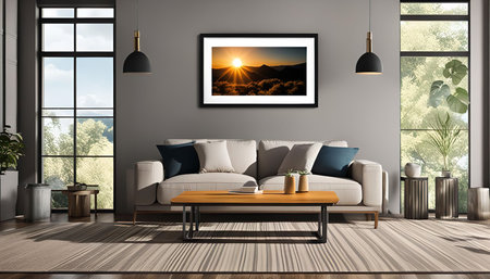 A contemporary living room with a framed photograph of a mountain sunset on a gray wall. The room is decorated with a beige sofa, a wooden coffee table, and two lamps. There is a plant on the floor and a window with a view of trees.
