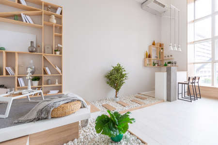 Luxury fashionable modern design studio apartment with a free layout in a minimal style. very bright huge spacious room with white walls and wooden elements.