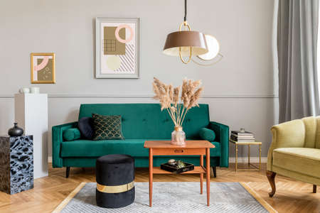 Stylish and tasty living room of apartment interior with elegant green velvet armchair and sofa, brwon table, design lamp and chic accessories. Abstract paintings on the gray wall. Luxury home decor.