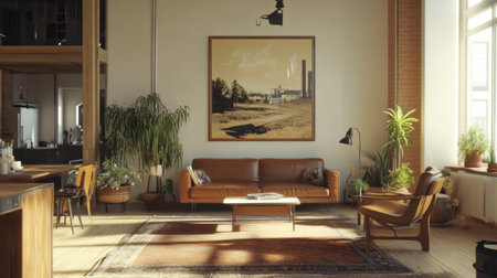 The clean and minimal interior design of living room in bright tone with the colorful and vintage painting. Generative AI AIG27.