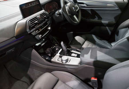 Bangkok, Thailand - March 28,2021 : Close up of BMW car leather interior in Bangkok, Thailand on March 28,2021.