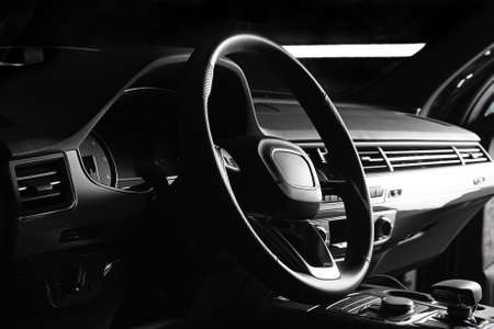 Interior view of modern car, Closeup of car steering wheel.