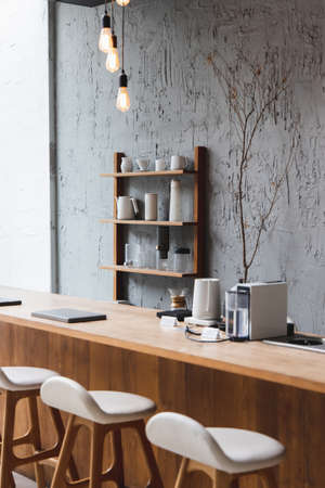Coffee shop interior with bar counter, chairs and vintage lamps.