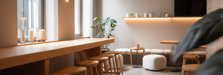 A serene and modern coffee shop interior featuring minimalist design elements. The bright space offers a clean atmosphere with wooden stools and tasteful decor.