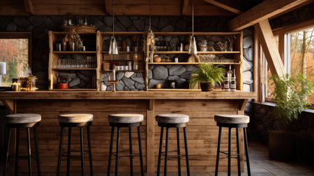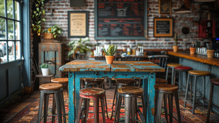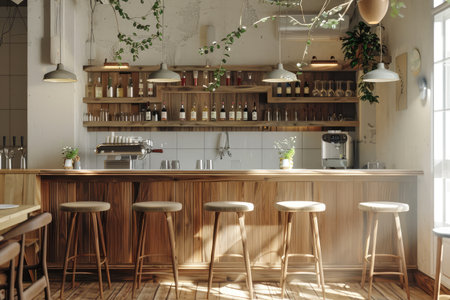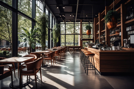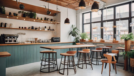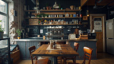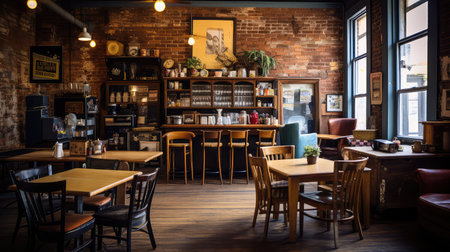 Cozy cafe interior with rustic wooden furniture and natural lighting