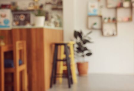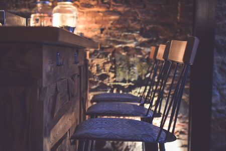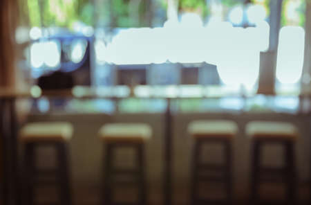 Selective focus on the high chairs in front of the counter bar at the coffee shop and cafe with the light of sunset from outside.