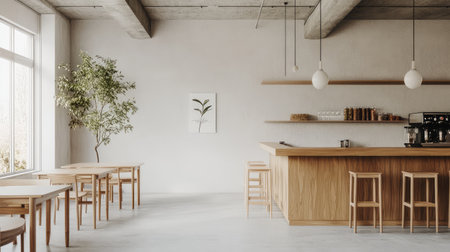 Bright, airy cafe space featuring sleek white walls, warm wooden furniture, and large windows that flood the area with soft, natural illumination.