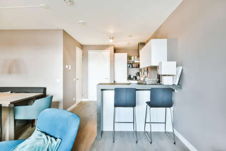 Counter with chairs dividing kitchen with modern furniture from dining area in contemporary flat