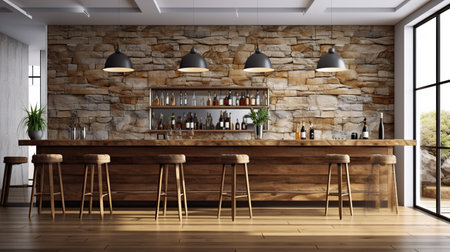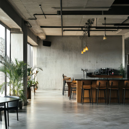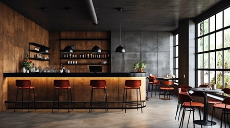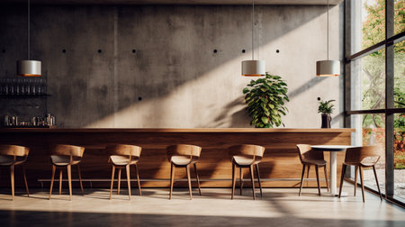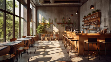 The interior of a modern cafe features a bar, chairs, concrete walls, and a wooden floor. Generative AI
