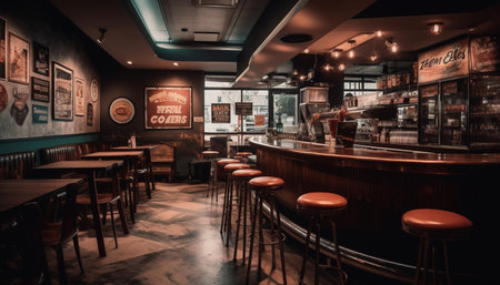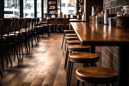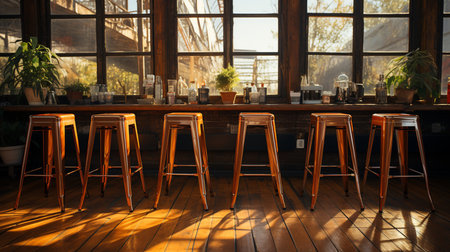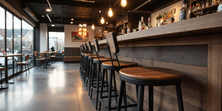a row of empty bar stools at a stylish restaurant counter, created with generative ai