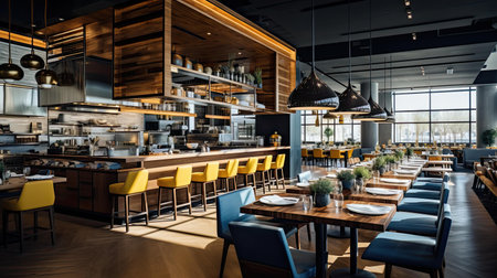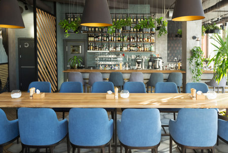 Interior of a stylish restaurant, cafe, with wooden tables with chairs, a bar and modern lamps.