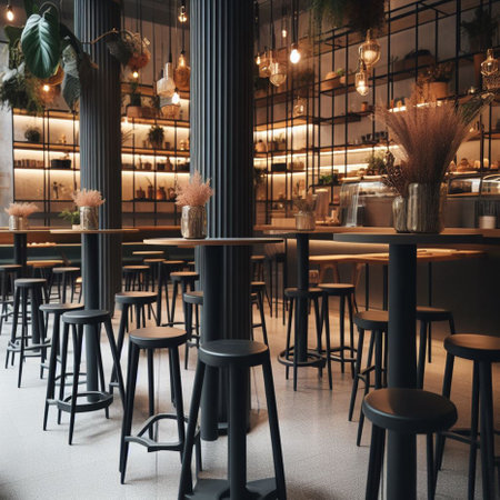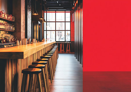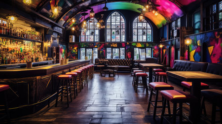 A beautifully designed bar interior featuring stylish seating and elegant decor. The modern space creates a vibrant and inviting atmosphere perfect for relaxation.