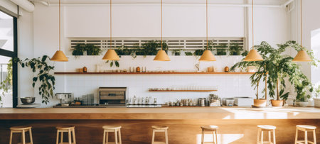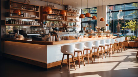 Cozy cafe interior with bar island and eating space with minimalist furniture