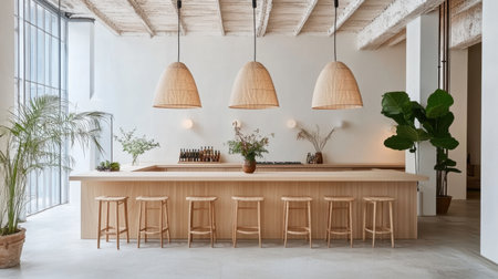 A spacious bar interior that showcases a blend of minimalist design and natural elements, ideal for creating a tranquil and inviting atmosphere for patrons.