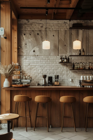 Coffee shop in the heart of downtown, the warmth of wood furniture and natural light. this coffee shop offers a serene retreat from the bustling city streets.