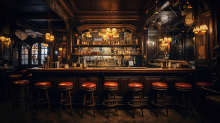 Explore the inviting ambiance of a charming pub with warm lighting and cozy seating.