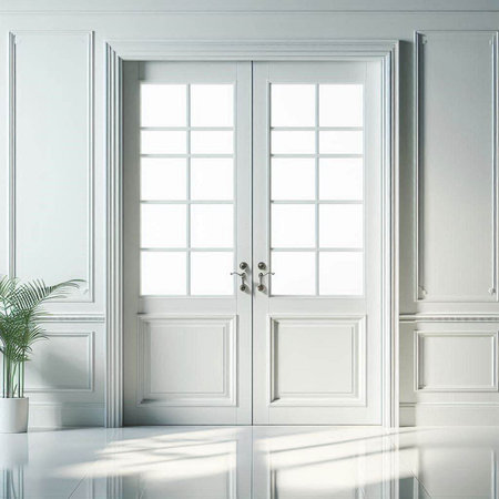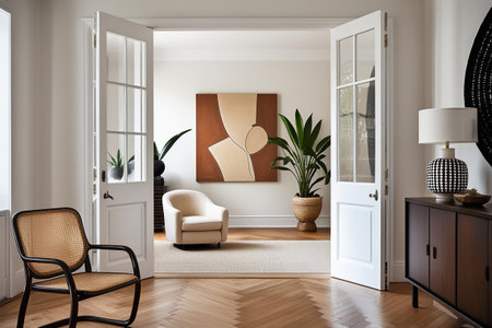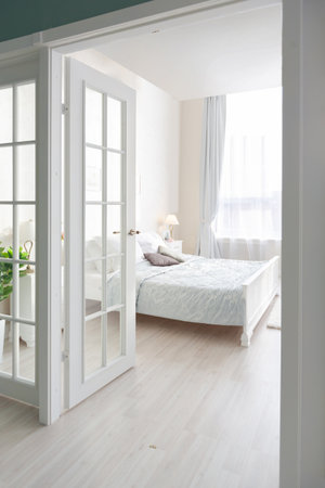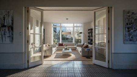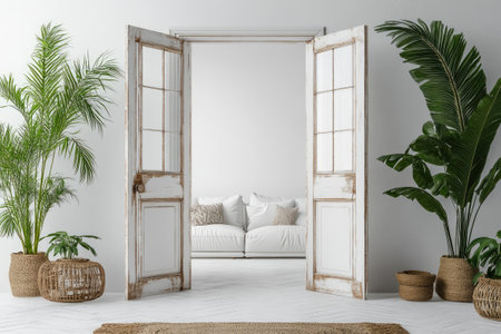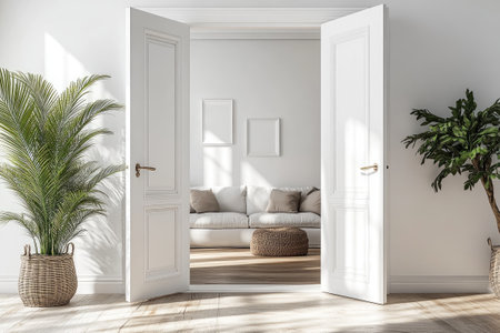 An interior shot features open white doors leading to another room. A vase of flowers sits on a small table. Soft, natural lighting bathes the scene. This image could be used for lifestyle, home decor, or interior design projects. It showcases a clean and inviting atmosphere.