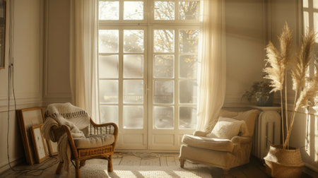 Sunlight filters through linen curtains casting a soft glow on the earthy tones of the room enhancing the cozy atmosphere that envelops the space..