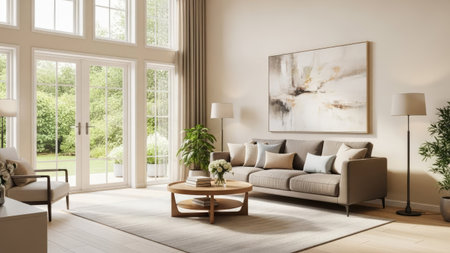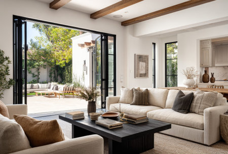 A bright living room features a cream-colored sofa and dark wood coffee table. Large doors reveal an outdoor patio. The interior showcases neutral tones and stylish decor. This versatile scene could be used for lifestyle, home decor, or interior design projects. Natural light bathes the space, creating a welcoming atmosphere.