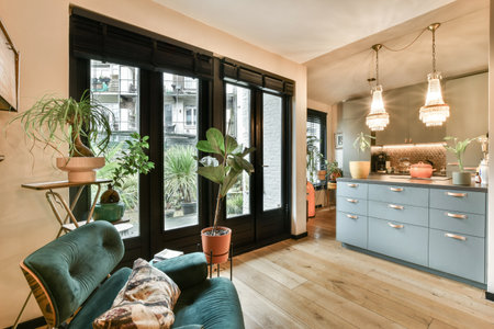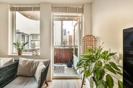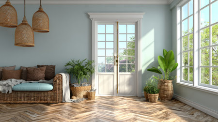 An interior shot showcases a living room with woven furniture and potted plants. Natural light streams through large windows, illuminating wooden flooring. The space features decorative pendant lights and a double door leading outside. This image could be used for lifestyle, home decor, or real estate related projects.