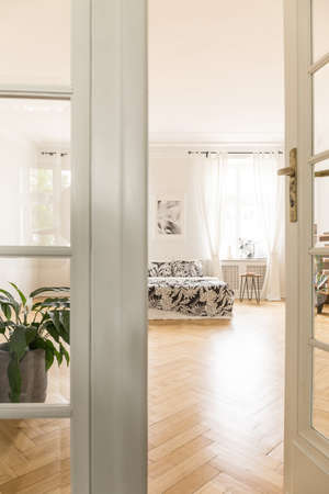 View through the door of spacious, bright bedroom interior with patterned bed and plant. Real photo