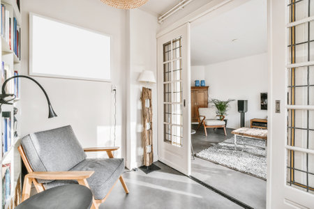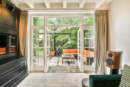 Sun is shining through the french window of a bright and cozy scandinavian style living room
