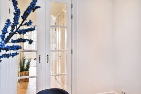 White door with glass panes separating halls of apartment with parquet flooring and flowers as decor