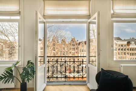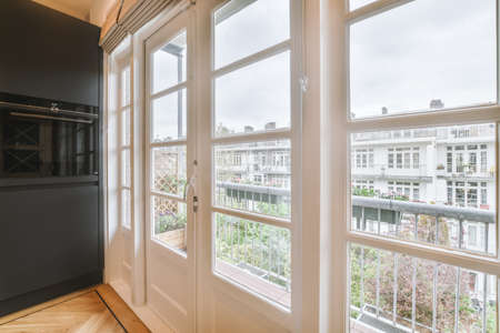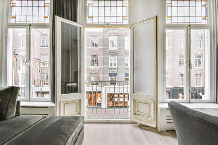 opened doors of the balcony of a classic house