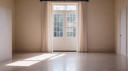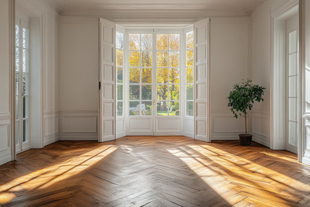An empty room showcasing bright natural light streaming through elegant windows, revealing a warm wooden floor and classic design elements, perfect for new beginnings.