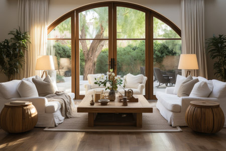 A photo of large French doors leading to an outdoor patio, with two sofas and a coffee table in the living room. The room is filled with natural light from windows and a skylight, and features white walls, plants on wooden tables, and a neutral color palette. --ar 53:30 --v 6.1 Job ID: 081fb1a3-532e-4f0a-a3b7-7ac44df3cbfc