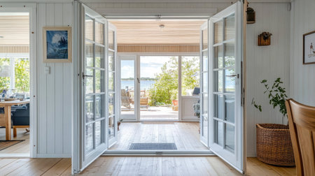 A beautiful interior view of a modern home showcases bright spaces and open doors leading to a serene waterfront. Perfect for relaxation and inspiration.