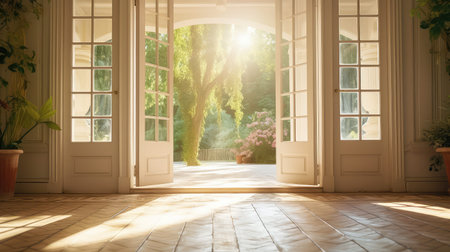 This stunning image captures a serene garden view framed by elegantly open wooden doors, showcasing lush greenery under warm sunlight, creating a peaceful atmosphere.