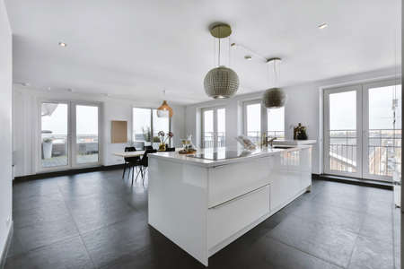 Modern minimalist style interior design of studio apartment with open white kitchen and dining zone with table and chairs illuminated by loft style lamp