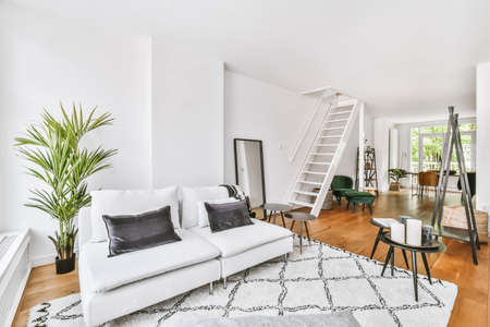 Cozy interior design of living room furnished with comfortable couch and table decorated with carpet in modern attic apartment with white walls