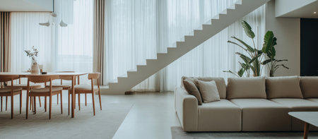 Modern home interior, a spacious living room with a sofa and dining table, a minimalist staircase in the background, white walls, large windows, soft lighting, gray couches, a light gray carpet on the floor, elegant decor, modern furniture, a neutral color palette, natural sunlight streaming through sheer curtains, high-resolution photography. --ar 23:10 --v 6.1 Job ID: 0f1e6422-67e0-4381-a609-7ff2c06ce642