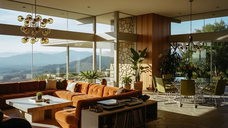 A bright and airy modern living room with large windows, featuring mid-century furniture, a cozy fireplace, and decorative elements like plants and artwork