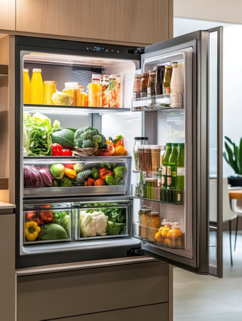 A sleek modern refrigerator filled with fresh produce and beverages. Ideal for showcasing healthy living, kitchen organization, and contemporary design.