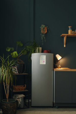 Modern Kitchen Displaying Plants, Refrigerator, and Lighting