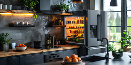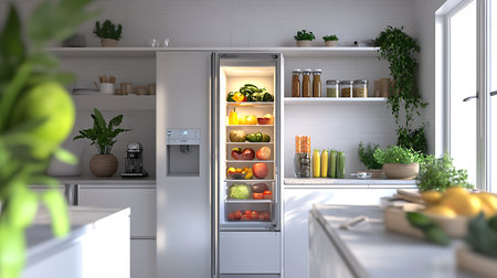 Modern kitchen with open refrigerator displaying fresh food and beverages. That the image is generated using AI.