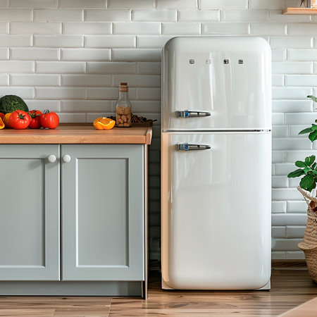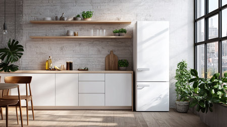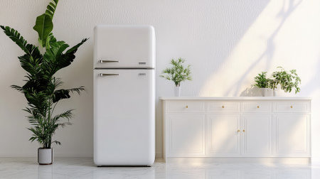 Bright kitchen interior featuring a sleek white fridge, lush indoor plants, and stylish furniture, creating a fresh and inviting living environment perfect for modern lifestyles.