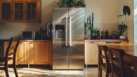 A modern stainless steel refrigerator with minimalist design, enhancing the sleek kitchen aesthetic.