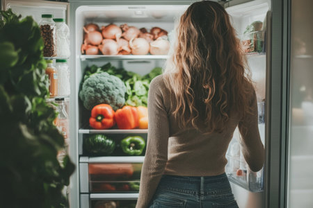 Captivating view of a young woman opening refrigerator to select fresh vegetables for healthy cooking